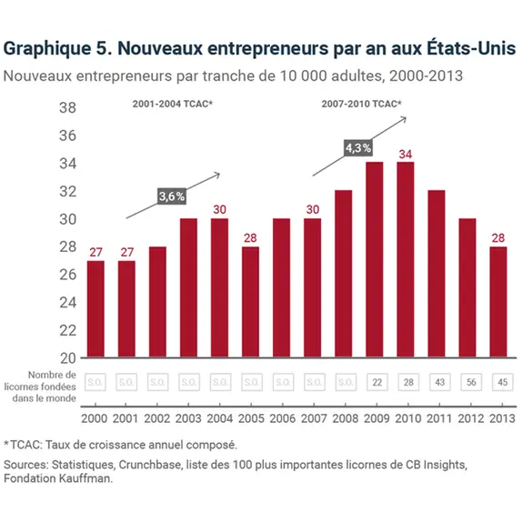Les périodes de récession et la phase initiale des reprises sont associées à la création d’un grand nombre d’entreprises (graphique 5). Des entreprises de grande influence, telles que LinkedIn, Tesla, Facebook et Shopify, ont toutes été lancées dans le sillage de l’éclatement de la bulle Internet. Airbnb, Uber, Slack et Stripe ont toutes démarré pendant la Grande Récession de 2007-2009.