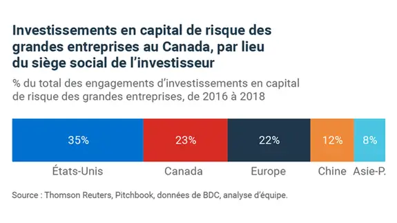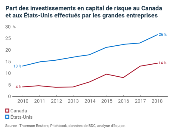 À l’échelle mondiale, le Canada n’investit pas autant qu’il le pourrait. Les transactions de capital de risque des entreprises basées au Canada représentent 1 % de la valeur mondiale des investissements en capital de risque réalisés par des grandes entreprises entre 2011 et 2017, alors que le PIB du Canada représente 2 % du PIB mondial, selon Global Corporate Venturing.