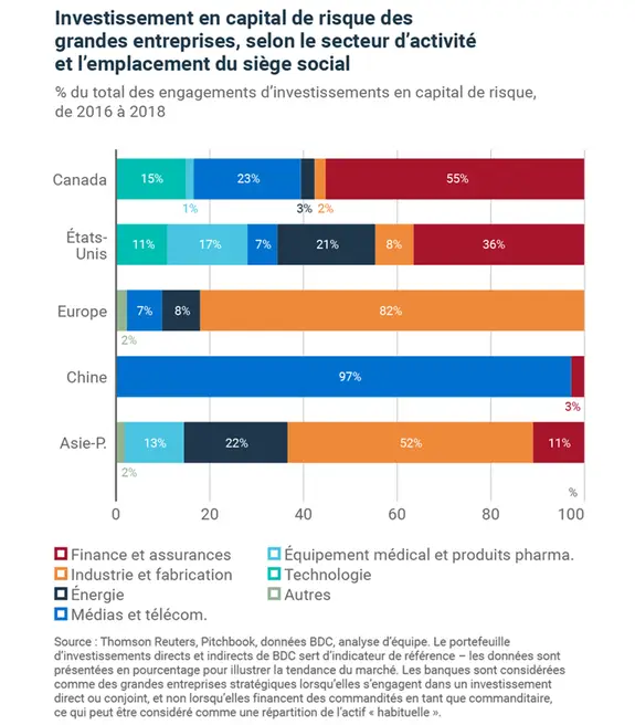 Lorsque l’on examine la répartition par secteur des investissements en capital de risque des grandes entreprises au Canada, on constate que les banques comptaient pour 55 % des investissements, tandis que les sociétés industrielles, manufacturières et énergétiques n’en représentaient qu’environ 5 %.