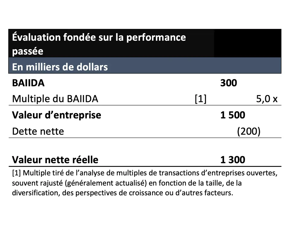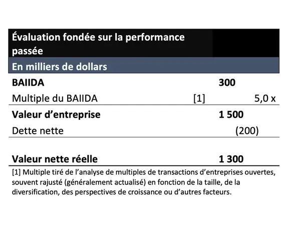 Prenons l’exemple d’une entreprise dont le BAIIDA est de 300 000 $. En supposant un multiple de BAIIDA de 5 x, l’entreprise serait évaluée à 1 300 000 $.