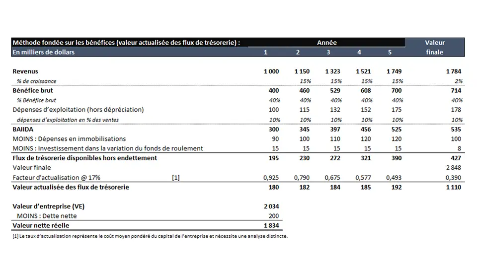 Par contre, l’évaluation de la même entreprise en fonction des flux de trésorerie prévus, avec un taux de croissance estimé à 15 %, donne une valeur nette réelle de 1 834 000 $.