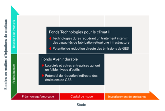Le Fonds Avenir durable s’inscrit en complément du Fonds Technologies pour le climat II. Les principales distinctions entre les deux fonds sont les modèles d’affaires des entreprises dans lesquelles ils investissent ainsi que le capital requis par celles-ci. Alors que le Fonds Avenir durable cible les entreprises de logiciels ayant de faibles besoins en matière d’injections en capitaux, le Fonds Technologies pour le climat II vise les entreprises qui ont de grands besoins en matière de capitaux et des actifs importants.