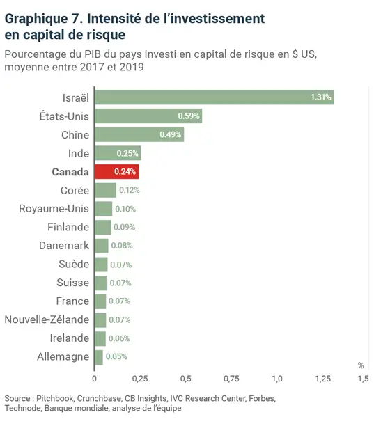 L’écosystème canadien du capital de risque a comblé l’écart avec les États-Unis sur le plan du rendement pour les investisseurs et investisseuses. Un taux de rendement interne de 12 % sur cinq ans a attiré davantage de capitaux privés. Cela a fait du secteur canadien un leader en matière de disponibilité de capital de risque, accroissant ainsi l’intensité de l’investissement en capital de risque (graphique 7).