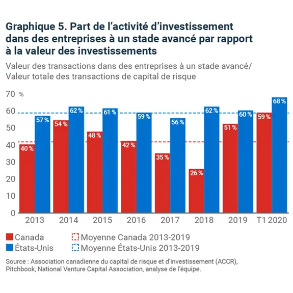 Au Canada, la proportion des transactions de capital de risque à un stade avancé a nettement augmenté depuis 2017. Cela signifie que les entreprises technologiques canadiennes établies bénéficient d’un soutien accru pour leurs ambitions de croissance, au pays et à l’étranger. La part des investissements canadiens en capital de risque dans des entreprises à un stade avancé rivalise désormais en nombre avec celle des États-Unis (graphique 4). Toutefois, en valeur globale, le Canada demeure derrière les États-Unis (graphique 5).