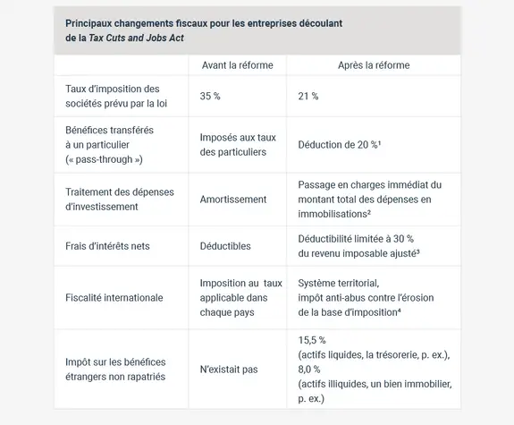 Les principaux changements fiscaux pour les entreprises découlant de la loi promulguée par le président Trump le 22 décembre 2017 sont résumés dans le tableau suivant: