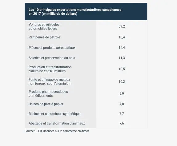 La plupart sont vendus aux États-Unis, qui absorbent 80 % des exportations manufacturières canadiennes. À titre de comparaison, 4 % des exportations sont destinées à la Chine et 3 %, à l’Europe.
