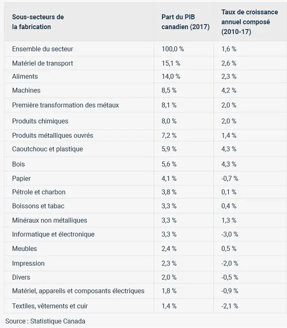 Les trois principaux sous-secteurs de la fabrication sont ceux du matériel de transport, des aliments et des machines. Leur production combinée a représenté 38 % de la production manufacturière totale en 2017. En revanche, depuis 2010, la croissance de la production a été la plus forte dans les secteurs de la fabrication de produits en bois, de produits en caoutchouc et en plastique et de machines.