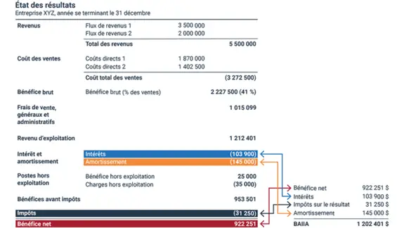 On considère souvent que le BAI reflète mieux la rentabilité que le résultat net, car les entreprises paient des impôts à des taux différents selon les provinces et territoires. Dans l’exemple d’état des résultats ci-dessus, le BAI est de 953 501 $.