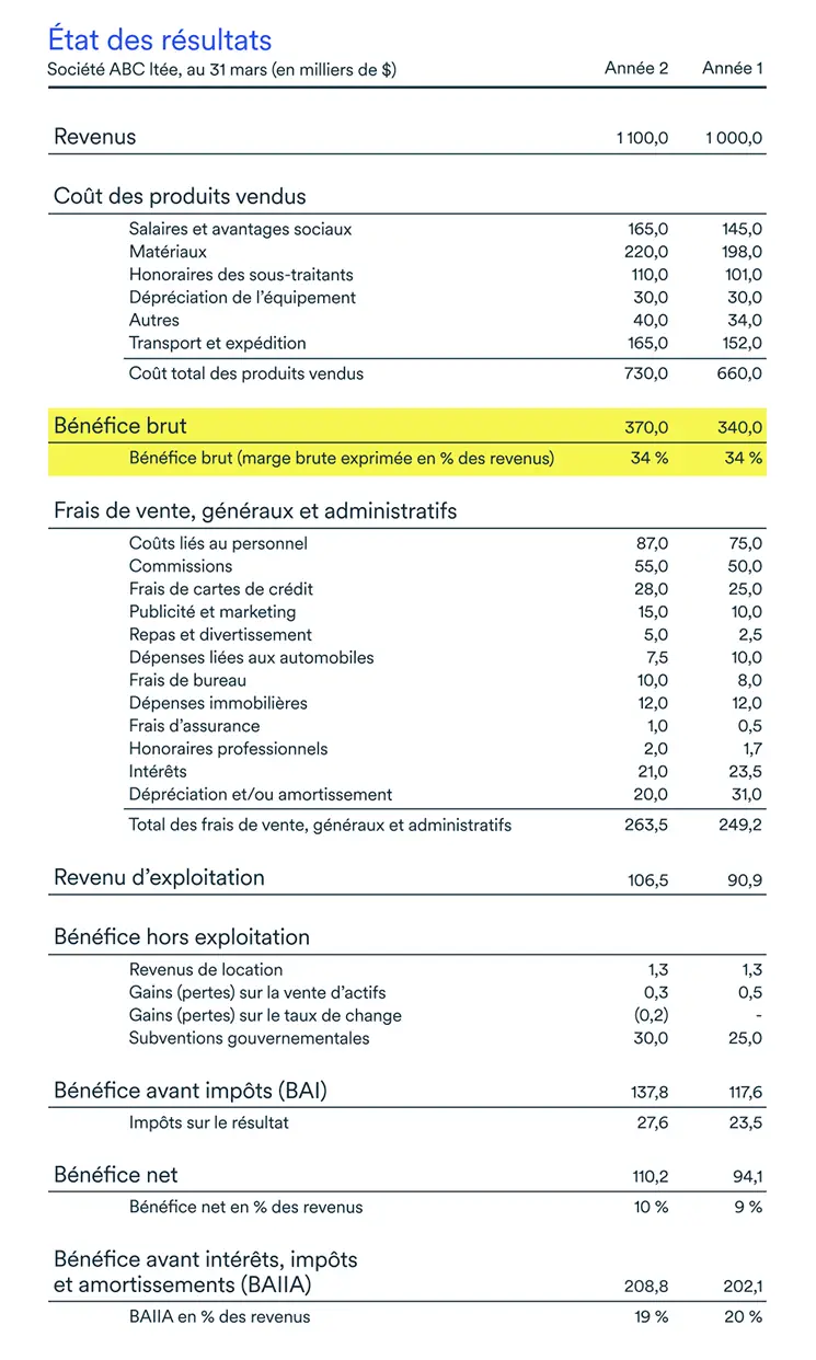 Dans l’exemple d’état des résultats ci-dessus pour ABC ltée, le revenu est passé de 1 000 000 $ à 1 100 000 $ entre l'année 1 et l'année 2, et le bénéfice brut a augmenté de 340 000 $ à 370 000 $, alors que la marge brute est restée la même à environ 34 %. Certains coûts ont diminué par rapport aux revenus, tandis que d’autres sont restés identiques ou ont augmenté. Par exemple, les salaires et les avantages sociaux étaient de 165 000 $ à l'année 2, soit 15 % des revenus. C’est un peu plus qu’à l'année 1, où les salaires et les avantages sociaux avaient coûté 145 000 $, soit 14,5 % des revenus de cette année-là.