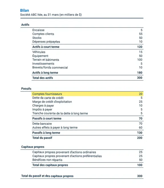 Les comptes fournisseurs figurent au passif à court terme de votre bilan. Les dettes à long terme et les effets à payer à long terme sont inscrits comme passif à long terme. Ils représentent la dette totale (à court terme et à long terme) de l’entreprise. Les capitaux propres, qui figurent également au bilan, montrent combien les actionnaires ont investi dans l’entreprise, soit en y plaçant de l’argent, soit en conservant les bénéfices dans le temps. Le bilan de votre entreprise montre que l’actif total est égal au total du passif (à court terme et à long terme) et des capitaux propres.
