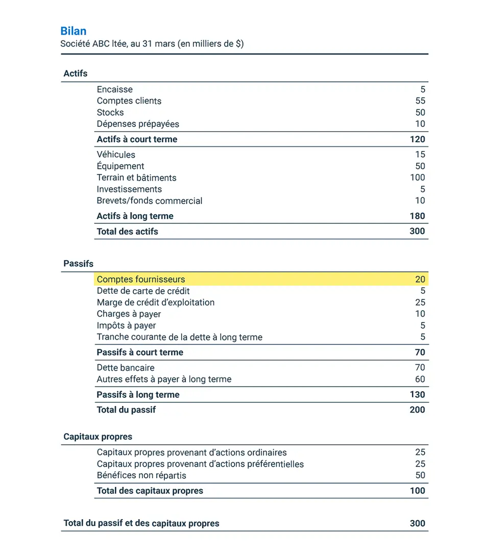 Le bilan ci-dessous présente les comptes fournisseurs de la société ABC ainsi que ses autres dettes à court terme. Ces dettes sont répertoriées par ordre de priorité de paiement, du plus urgent au moins urgent. Les comptes fournisseurs devant être payés dans les 30 jours suivant le passif à court terme, ils sont les plus urgents et ont la priorité sur la trésorerie de l’entreprise.