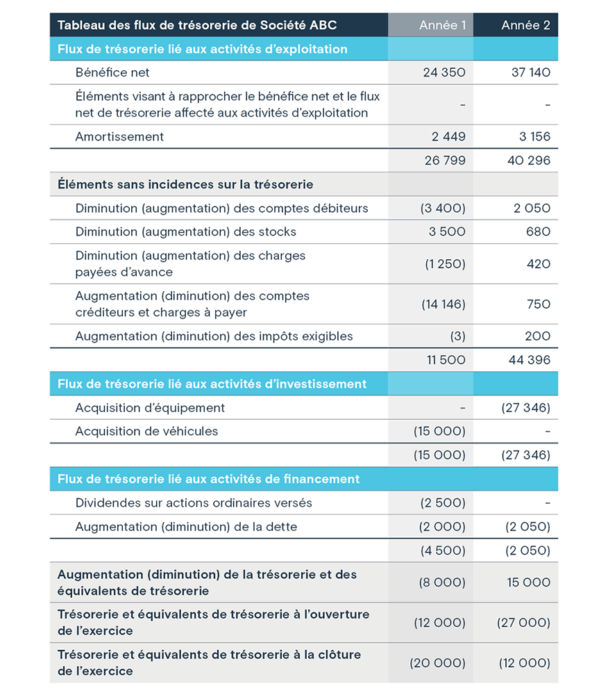 Le chiffre entre parenthèses correspond à une diminution de la situation de trésorerie. Ainsi, dans le cas du [(3 400)], ABC a émis une facture et enregistré la vente à titre de revenu, mais n’a pas encore perçu le paiement. Autrement dit, le solde des comptes débiteurs de l’année 1 serait plus élevé que celui de l’année 0.
