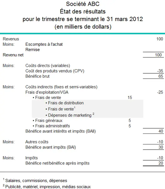 L’extrait ci-dessous indique la façon dont on présente les frais de vente dans l’état des résultats d’une entreprise et comment on les utilise pour calculer les coûts totaux et le bénéfice avant intérêts et impôts.