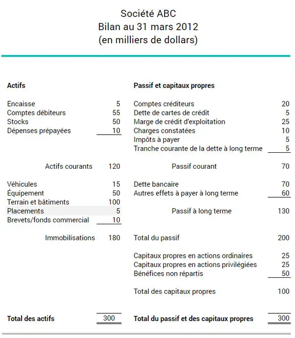 Le bilan ci-dessous montre que la société ABC détient une propriété à long terme dans une autre entreprise sous forme d’un placement de 5 000 $.