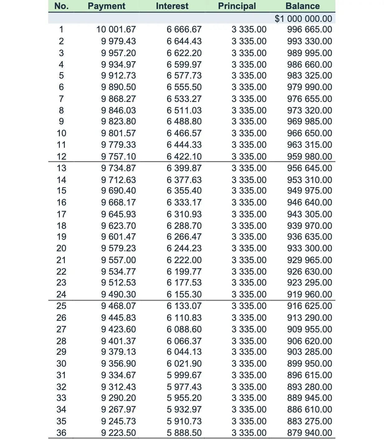 Par exemple, dans le cas d’un prêt de 100 000 $ avec une période d’amortissement de 10 ans, nous divisons 100 000 $ par 120 (le nombre de mois) pour obtenir des versements mensuels de capital de 833,33 $.