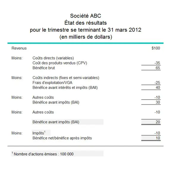 L’état des résultats ci-dessous montre que la société ABC a cumulé un bénéfice net de 20 000 $ en trois mois. La société ayant versé 10 000 $ en dividendes aux actionnaires, le ratio de distribution est: