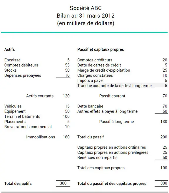 Le bilan ci-dessous montre une TCDLT de 5 000 $ pour la société ABC en date du 31 mars 2012. Comme il s’agit d’un montant relativement petit, l’entreprise effectue probablement les paiements périodiques prévus. Le calendrier des paiements serait inclus dans les notes afférentes aux états financiers.