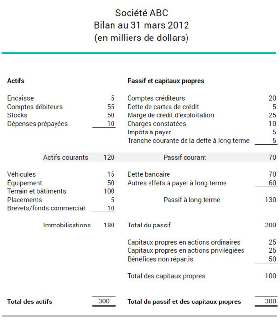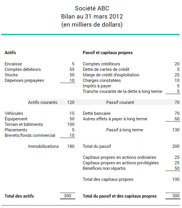 Les actifs à court terme sont inscrits au bilan du plus liquide au moins liquide. L’encaisse, par exemple, est plus liquide que les stocks. Dans l’exemple ci-dessous, la société ABC a 120 000 $ d’actifs à court terme et 70 000 $ de passif à court terme.