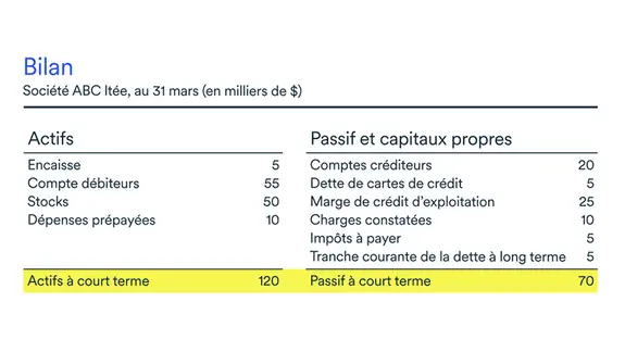 Dans ce bilan, pour calculer le ratio, on additionne l’encaisse de 5 000 $ et les comptes clients de 55 000 $ pour obtenir un actif à court terme de 60 000 $. Remarquez que les stocks et les dépenses prépayées ne sont pas inclus dans le calcul puisqu’on ne peut les convertir en espèces rapidement.