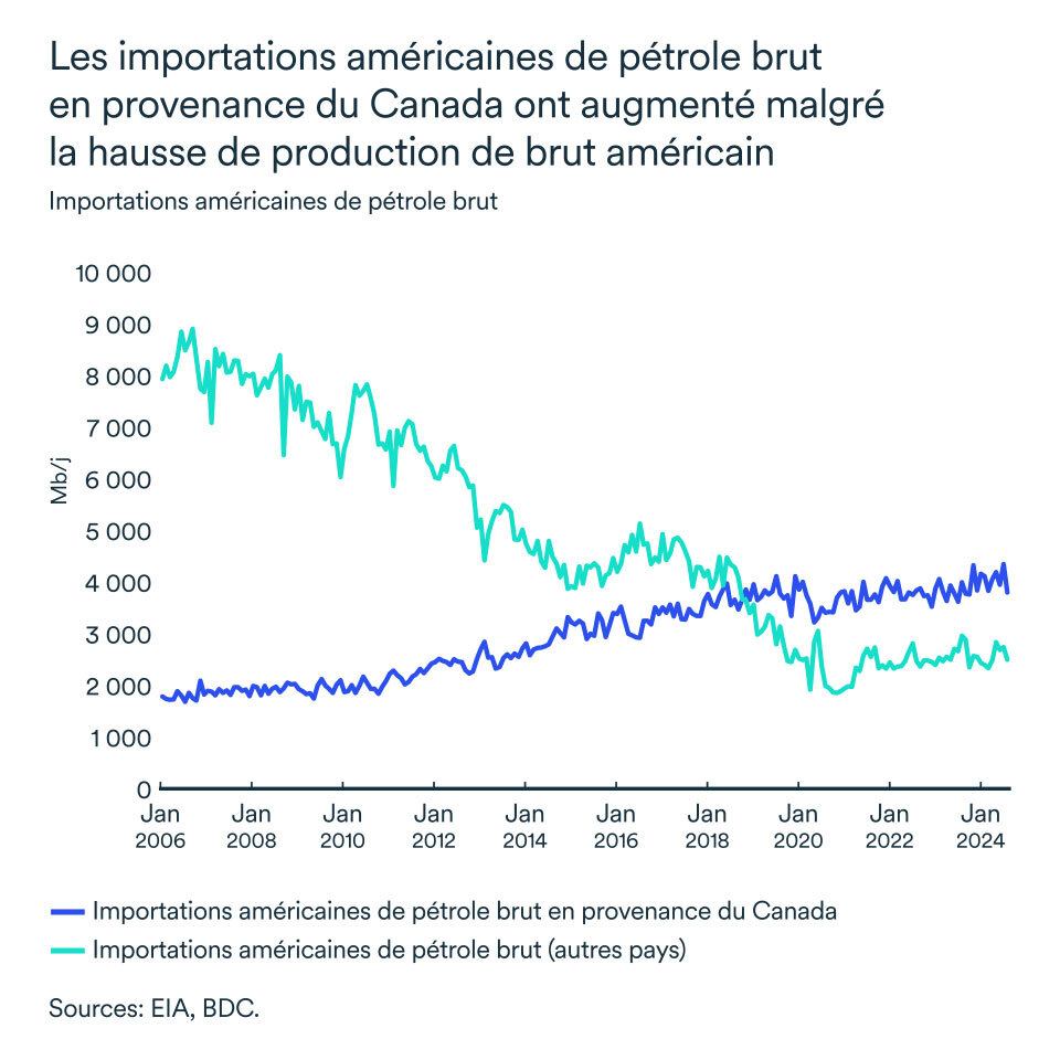 Au cours de son premier mandat à la présidence, Donald Trump n'a pas imposé de droits de douane sur le commerce de l'énergie, contrairement à d'autres biens intermédiaires (par exemple les intrants) comme les importations d'acier et d'aluminium canadiens. Autre signe que sa toute nouvelle administration pourrait être plus encline au secteur énergétique canadien, il a également soutenu l'expansion de l'oléoduc Keystone XL, qui aurait permis d'acheminer davantage de brut de l'Ouest canadien vers les États-Unis.