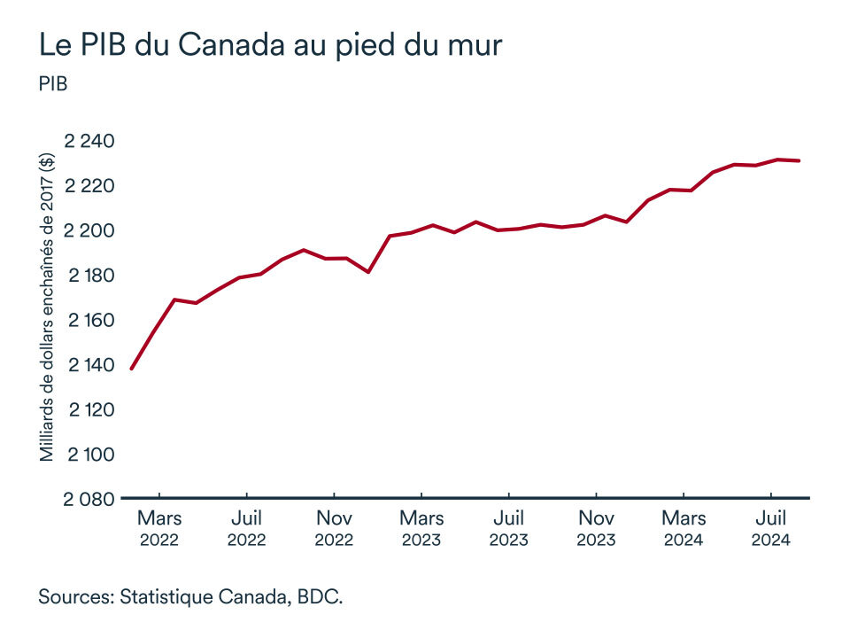 Au cours des huit premiers mois de l’année, l’économie canadienne a progressé de 1,1 % par rapport à la même période en 2023. Considérant que des vents de face soufflent encore sur l’économie canadienne, la croissance devrait ralentir encore davantage au dernier trimestre de l’année, voire se replier pendant un mois ou deux, ce qui porterait la croissance annuelle à 1,0 % pour 2024.