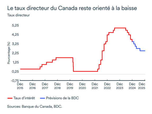 - L'imposition de droits de douane sur toutes les importations américaines, et plus particulièrement sur les importations chinoises, pourrait perturber le commerce mondial, réduire la demande de produits canadiens et accroître la pression sur les prix aux États-Unis, ce qui limiterait la capacité de la Fed à réduire les taux d'intérêt.