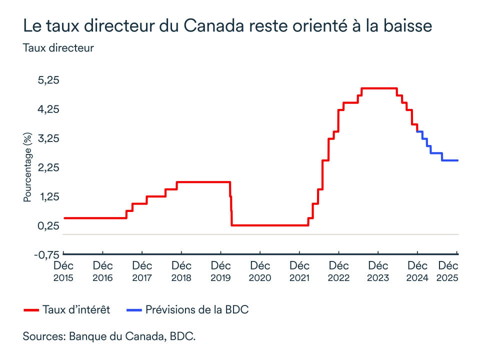 La sous-performance de l'économie et une inflation bien maîtrisée avaient déjà poussé la Banque du Canada à abaisser ses taux d'intérêt plus tôt que la plupart des banques centrales. Le taux directeur a connu trois baisses consécutives de 25 points de base en juin, juillet et septembre avant que le gouverneur Tiff Macklem donne un véritable coup de hache en octobre en procédant à une baisse de 50 points.