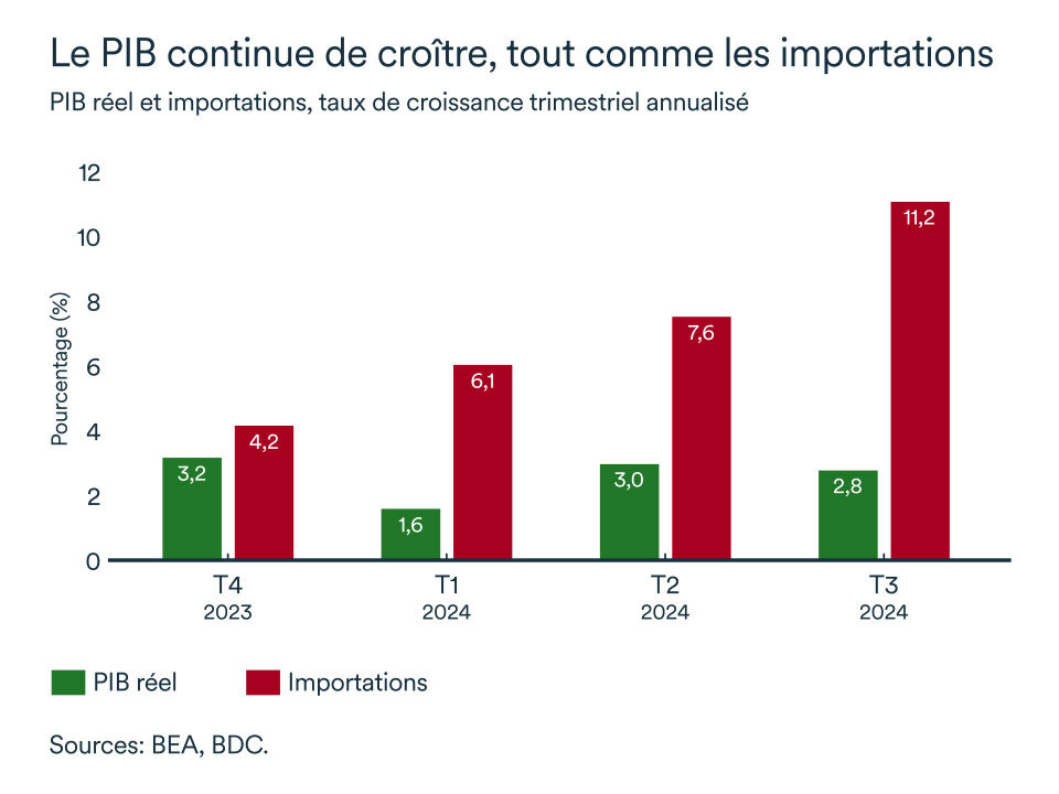 Le PIB réel a ainsi augmenté au rythme annualisé de 2,8 % au troisième trimestre. Il s’agit d’une légère perte de vitesse par rapport à la croissance du second trimestre (+3,0 %). L’élan qui souffle présentement sur l’économie américaine devrait toutefois se modérer au quatrième trimestre – autour de 2,0 % selon les indicateurs avancés.