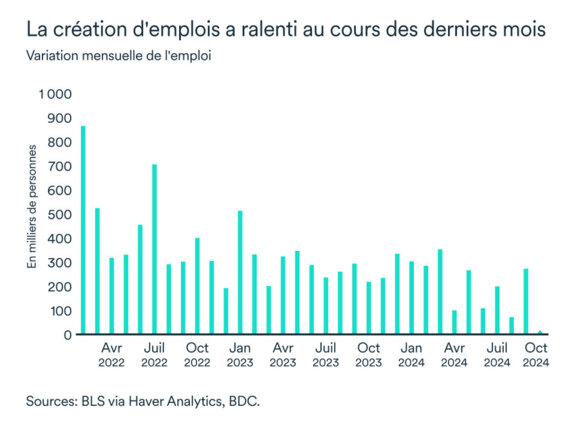 Le marché du travail s’est affaissé en octobre, alors que le Bureau de statistique du travail américain estime que seulement 12 000 emplois ont été créés par rapport au niveau de septembre. Des évènements extraordinaires et surtout temporaires peuvent expliquer en partie ce ralentissement, mais l’ampleur semble trop importante pour être attribuable seulement aux ouragans et à la grève chez Boeing.