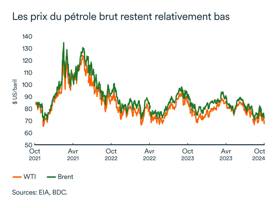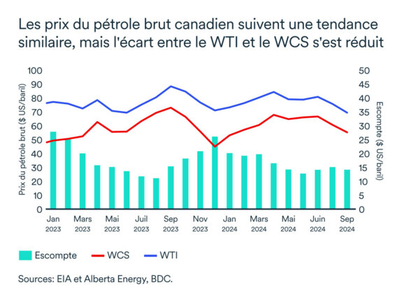 L’écart entre le Western Canadian Select (WCS) et le West Texas Intermeidate (WTI) était d’environ 12$ US en octobre 2024, une amélioration considérable par rapport à la même période l’an dernier alors qu’il était plus près des 25$ US.