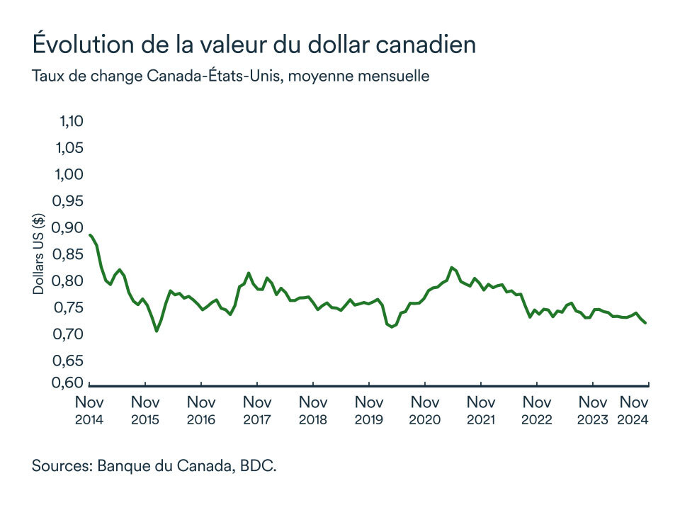 Le dollar canadien a baissé par rapport au billet vert en octobre. La tendance à la baisse s'est accélérée depuis l'élection américaine du 5 novembre. Le dollar canadien s'est même négocié sous la barre des 0,72 dollars américains le lendemain de l'élection de M. Trump – son niveau le plus bas atteint depuis l’éclosion de la pandémie en 2020. Le récent recul du dollar canadien s'explique par les différences de situation économique entre les deux pays. Alors que le PIB américain continue d'augmenter à un rythme relativement soutenu, que l'économie crée de nombreux emplois et que les dépenses de consommation augmentent, l'économie canadienne est plus tempérée. Avec l'élection de Trump, le dollar canadien devrait glisser encore plus et pourrait se rapprocher des 70,0 cents américains au début de 2025, selon quelles politiques de la nouvelle administration américaine occuperont le devant de la scène.