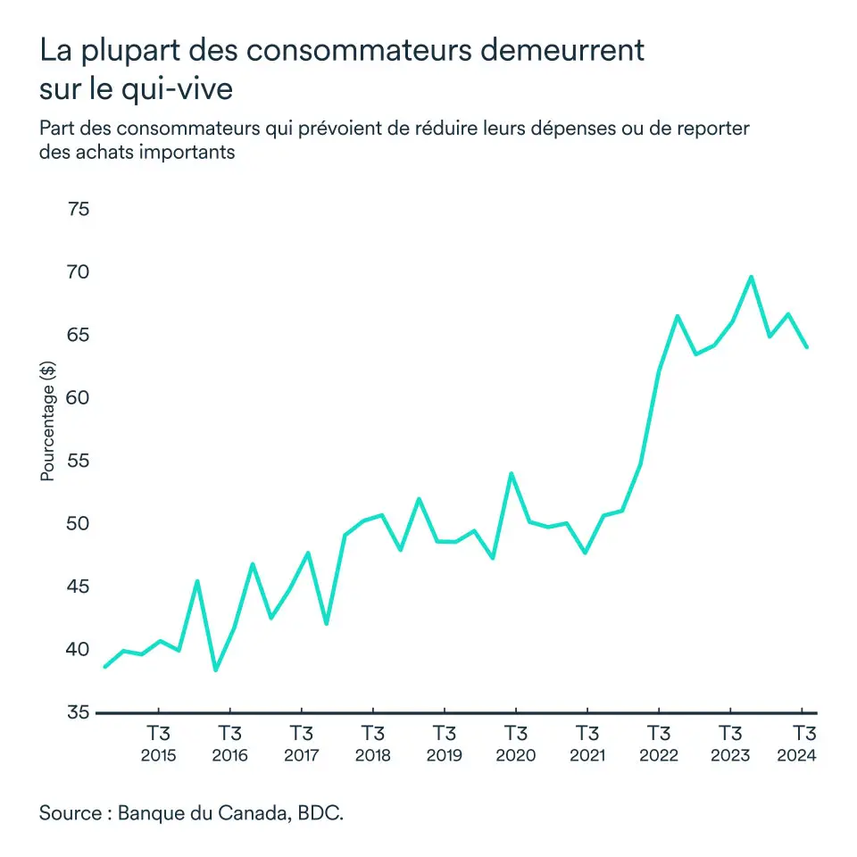 Les ménages canadiens, grâce à l’augmentation de près de 10 % de leur revenu disponible à la fin de 2024, ont su maintenir leur taux d'épargne à un niveau élevé tout en augmentant modestement le rythme de consommation. Ces deux facteurs sont de bon augure et continueront à alimenter la croissance des dépenses de consommation dans les mois à venir. La perception du stress financier s'est améliorée et, compte tenu des récentes réductions des taux d'intérêt et de la baisse de l'inflation, de moins en moins de consommateurs s’attendent à réduire leurs dépenses. Ils demeurent toutefois vigilants, car l’endettement élevé continuera à peser sur les ménages canadiens.