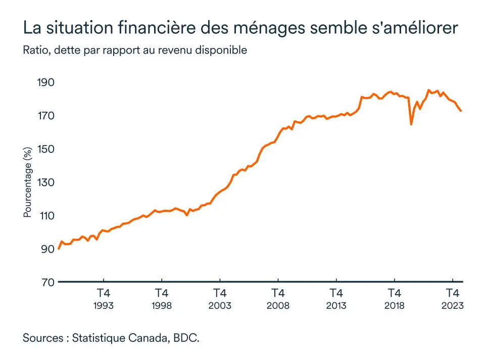 L’endettement des ménages a atteint 3 billions de dollars au troisième trimestre de 2024. Le ratio de la dette à la consommation et hypothécaire, en proportion du revenu disponible, a cependant baissé à 173,1 %, reculant ainsi pour un sixième trimestre consécutif. Il s'agit du plus bas ratio atteint depuis 2015, excluant la période de perturbations causées par la pandémie.