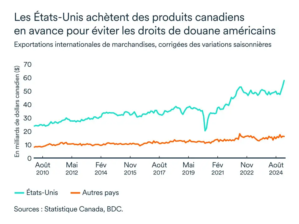 L’élan de fin d’année, marqué par un bon rythme en décembre (+0,2 %) s’est poursuivi en janvier 2025 avec une croissance estimée à 0,3 %, selon Statistique Canada. On s’attend à ce que les exportations contribuent positivement au PIB au début de l’année, alors que les entreprises américaines ont renforcé leurs inventaires de produits canadiens pour éviter les tarifs.