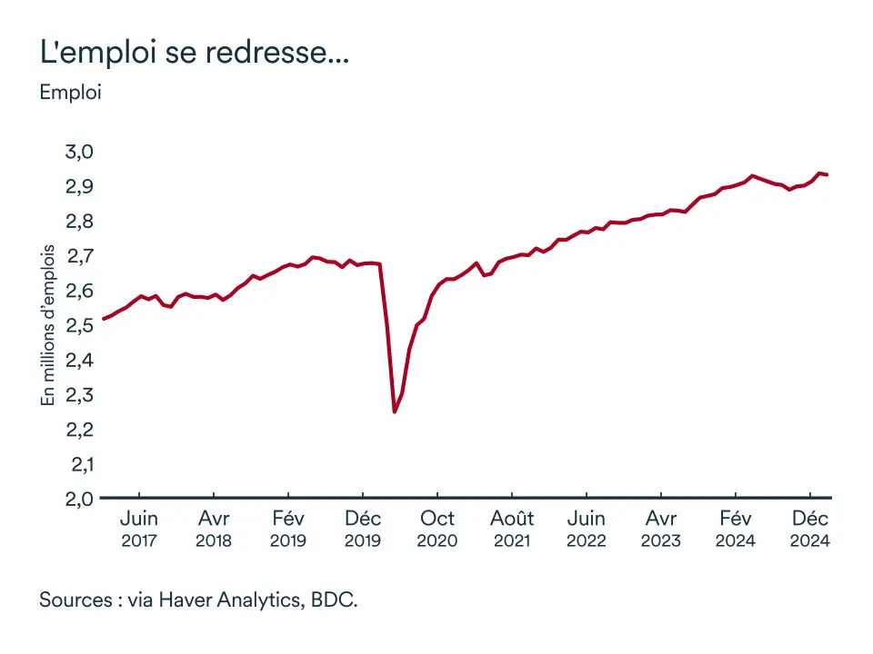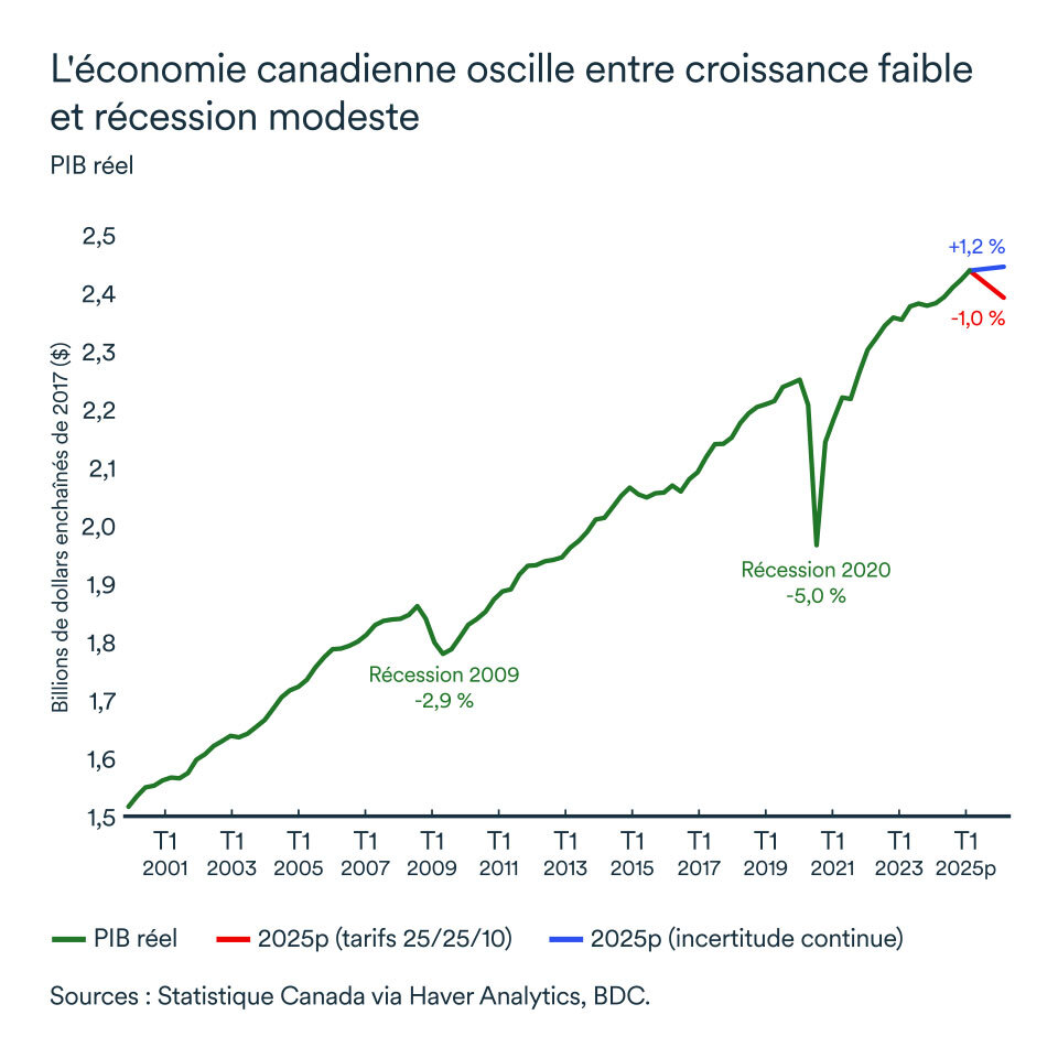 - Les vents contraires continuent de souffler sur le pays alors que l’incertitude liée aux tarifs plane toujours. Consommateurs et entreprises entrent dans une période de prudence par crainte d’un ralentissement économique. Les entreprises mettent leurs projets d’investissement et plans d’embauche en attente, alors que la consommation pourrait se montrer plus frileuse dans les prochains mois. La bonne nouvelle est que l’économie canadienne a continué de faire preuve de résilience et a même repris de l’élan à la fin de 2024. Cette période d’incertitude repose sur des bases solides.