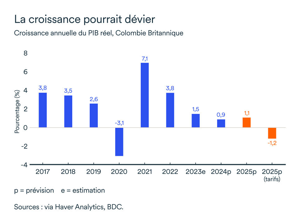 Alors que la baisse des taux continuera à jouer en faveur des Britanno-Colombiens, les tensions commerciales actuelles causent déjà des dommages. L’impact des tarifs, bien que ces menaces ne se soient pas encore concrétisées, dépendra de leur durée et de leur ampleur et la Colombie-Britannique pourrait être confrontée à une légère récession.