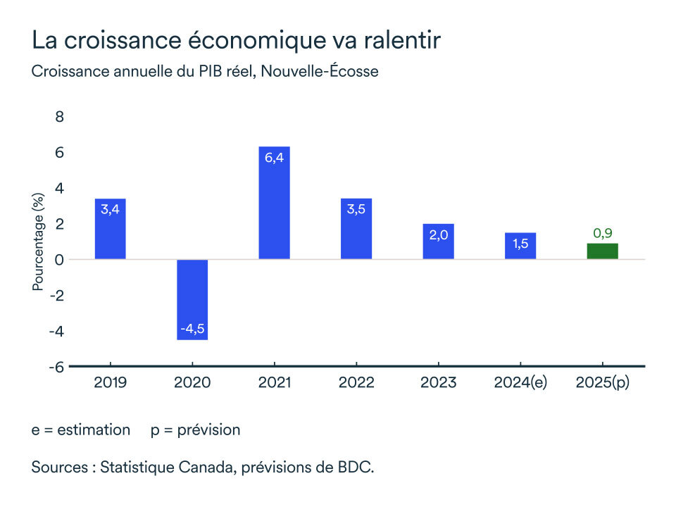 Par ailleurs, le ralentissement de la croissance démographique et l'absence de grands projets d'investissement limiteront les perspectives de croissance cette année. Néanmoins, la province devrait être en tête des provinces atlantiques alors que le PIB réel devrait augmenter de 1,5 % en 2025.