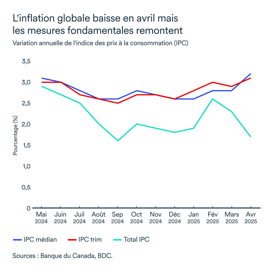 La Banque du Canada a maintenu son taux directeur à 2,75 % lors de l’annonce du 4 juin. L’inflation globale, mesurée par la variation annuelle de l’indice des prix à la consommation, a ralenti à 1,7 % en avril. En revanche, les mesures d’inflation fondamentales, privilégiées par la Banque du Canada pour déterminer s’il y a lieu de s’inquiéter ou non des variations de prix, ont repris de la vigueur et dépassent toutes les 3 %.