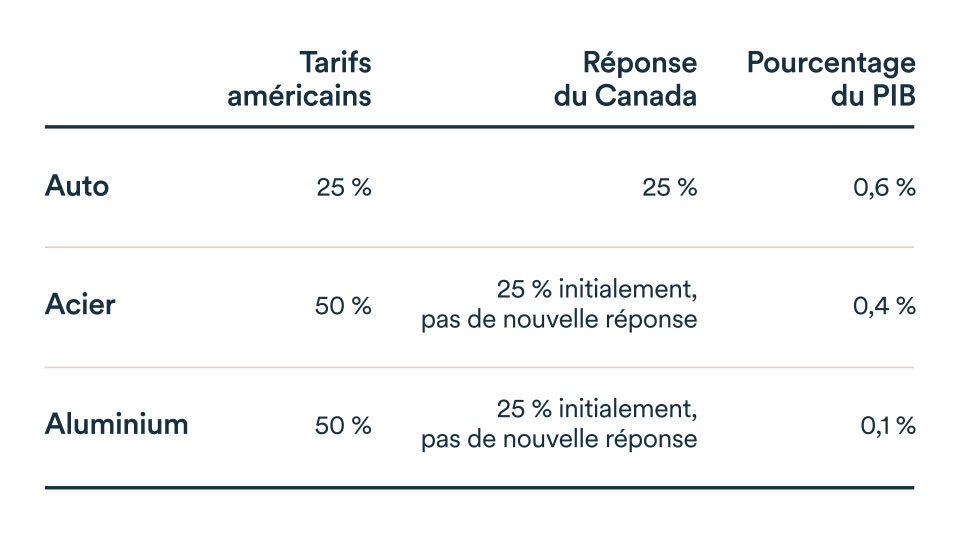 Bien qu'un scénario catastrophe soit actuellement exclu, les répercussions au Canada varient selon les provinces, l'Ontario étant la plus affectée en raison de sa structure économique. Si les secteurs visés ne représentent qu'un peu plus de 1 % du PIB de la province, ils constituent néanmoins environ un tiers de ses exportations.