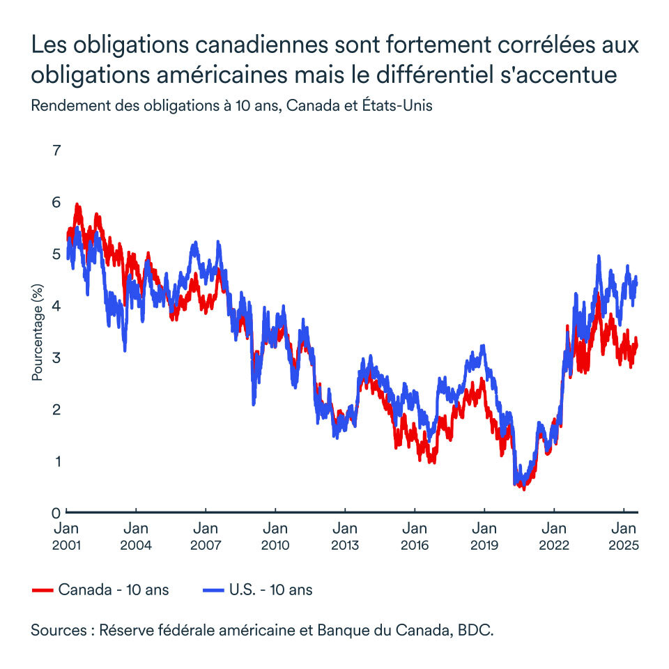 Le rendement à la hausse des obligations repose principalement sur les anticipations des investisseurs. Avec le temps, ces derniers s’habitueront probablement à vivre un peu mieux avec l’inconfort du conflit commercial. La prime de risque pourrait donc être appelée à baisser, ce qui aiderait les taux à diminuer, mais il faudra s’armer de patience. Il serait surprenant de voir les taux d’intérêt diminué de manière significative avant 2026.