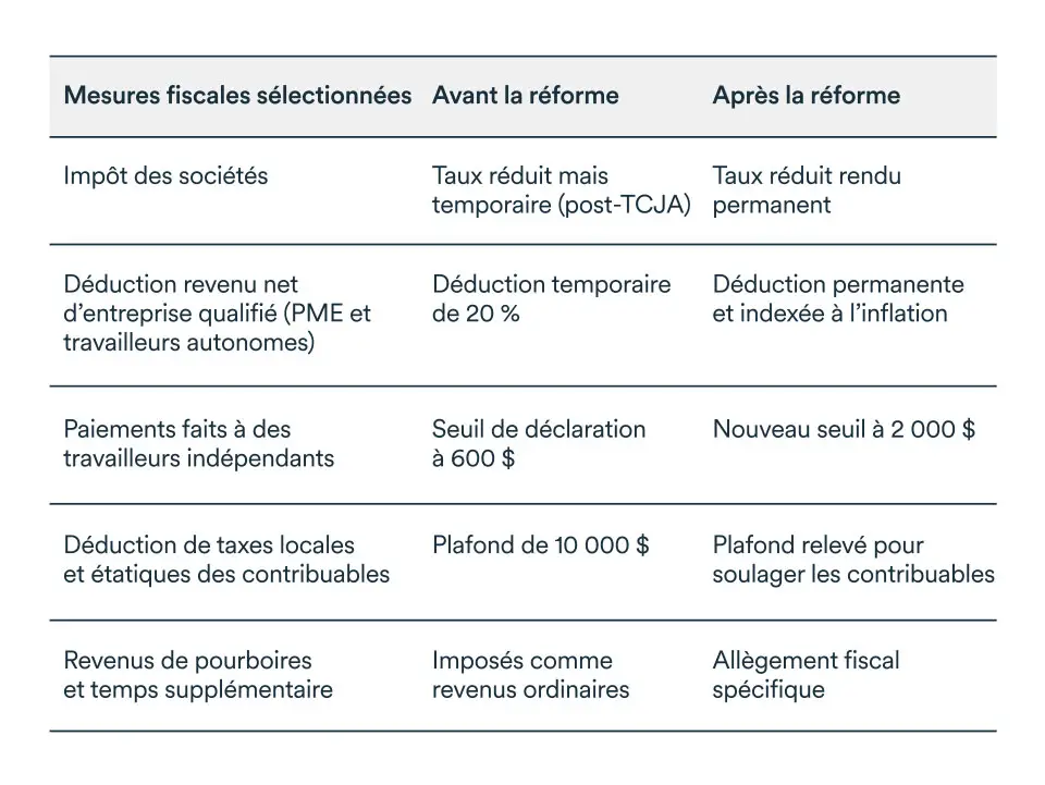 La nouvelle loi contient des centaines de changements fiscaux qui entraîneront des répercussions sur l’économie américaine. Bien qu’il s’agisse d’une loi américaine, ses effets se feront sentir au-delà des frontières, notamment au Canada en raison des liens économiques et fiscaux étroits entre les deux pays.
