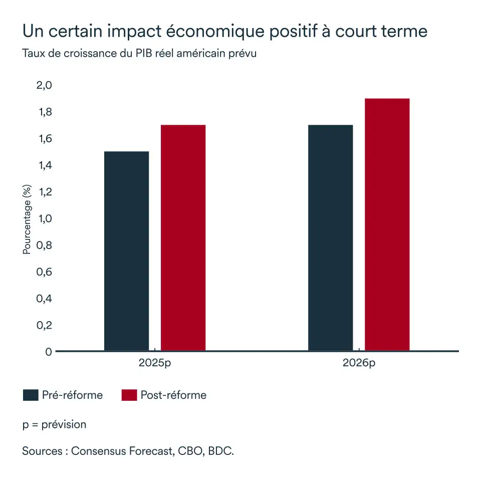 Avant l’adoption de la réforme, on s’attendait à ce que les États-Unis atteignent une croissance de 1,5 % en 2025 et 1,7 % en 2026. Les réductions d’impôt pourraient stimuler la demande américaine. La consommation et l’investissement devraient donc continuer à augmenter à court terme et se refléterait par une hausse annuelle de +0,2 points du PIB réel.