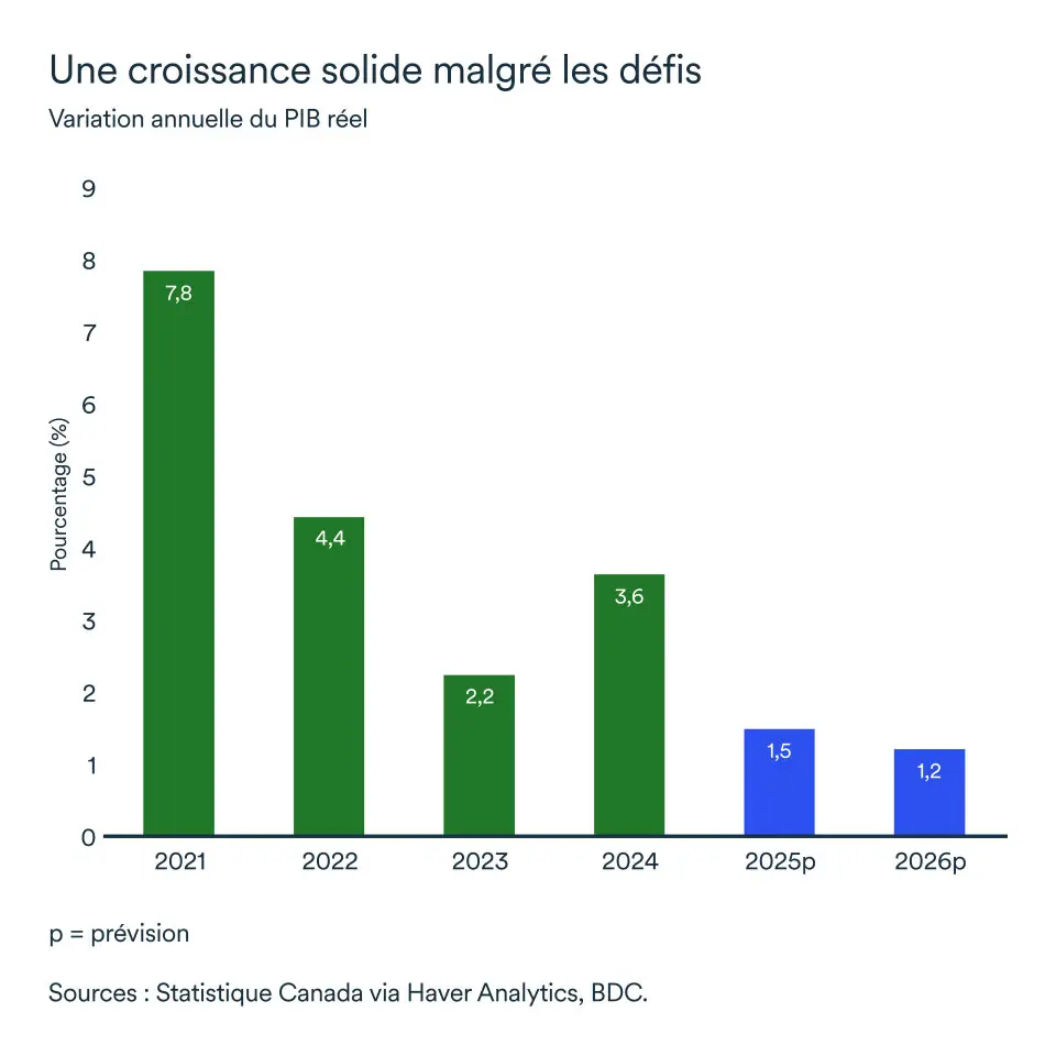 Au cours des huit premiers mois de l’année, l’économie canadienne a progressé de 1,3 % par rapport à la même période en 2024. Considérant que des vents de face soufflent encore sur l’économie du pays, le risque que la croissance ralentisse encore davantage au dernier trimestre de l’année demeure, mais des signes avant-coureurs pointent davantage vers une économie résiliente.