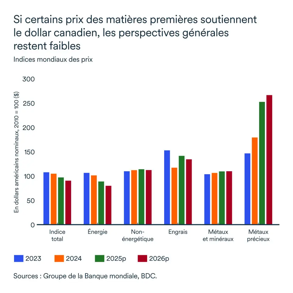 Sans amélioration du commerce mondial en 2026, les matières premières maintiendront une pression baissière sur le dollar canadien.