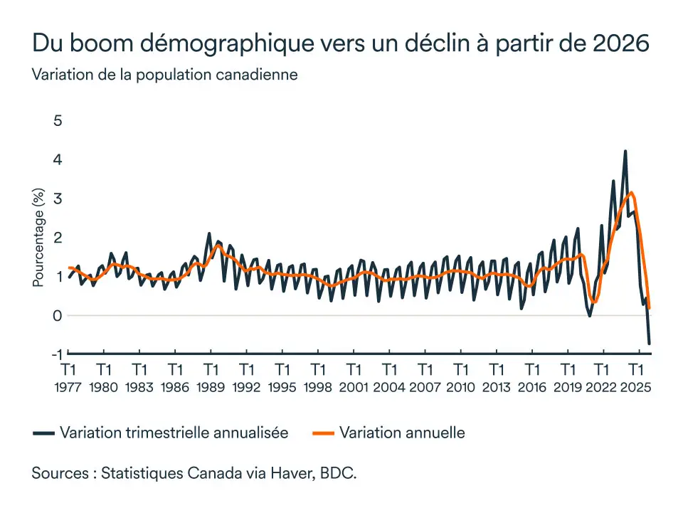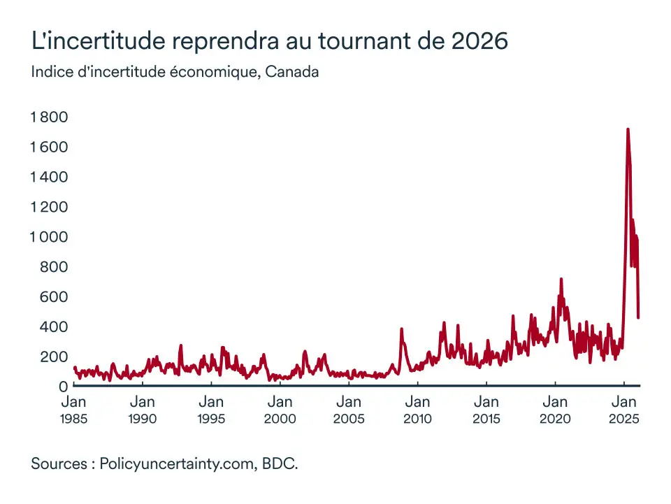 Habituellement, les réductions de taux par la banque centrale mettent plusieurs mois avant de faire sentir leur plein effet dans l’économie. Il y a donc encore bon espoir de voir les baisses de taux annoncées en 2025 soutenir l’économie réelle en 2026. Toutefois, il faudra probablement espérer que les autres taux d’intérêt (les taux fixes) suivent la parade, car les ménages canadiens semblent continuer à faire preuve de prudence en dépit de taux variables plus bas.
