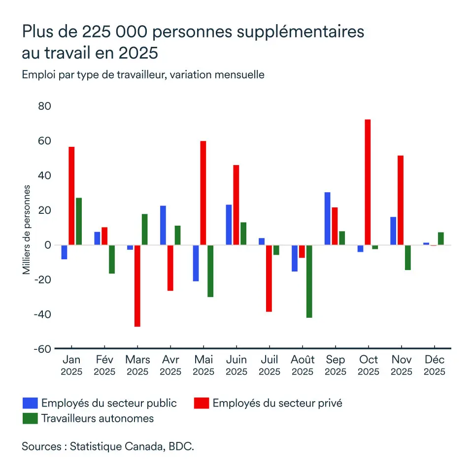 Même si la création d’emplois a ralenti en 2025, le Canada comptait alors 226 300 personnes de plus au travail qu’en 2024. Malgré l’incertitude et l’inquiétude des entreprises, le secteur privé a contribué à plus de 200 000 de ces nouveaux emplois, alors qu’au net, le nombre de travailleurs autonomes a diminué d’un peu moins de 30 000.