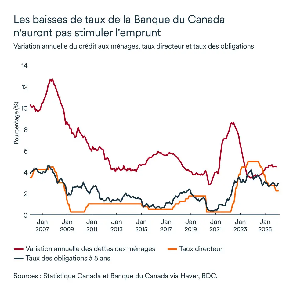 La Banque du Canada a réduit le taux directeur de 100 points au cours de 2025, passant de 3,25 % en janvier à 2,25 % un an plus tard. Pourtant, cette mesure n’a pas amené les ménages à recourir à l’emprunt outre mesure, comme l’indique la variation du crédit aux ménages. Il semble effectivement que les décisions de la banque centrale canadienne aient eu moins d’impact que dans le passé sur le marché des taux d’intérêt, et donc sur l’emprunt. Les taux d’obligations 5 ans, par exemple, n’ont pratiquement pas varié au cours des douze derniers mois.