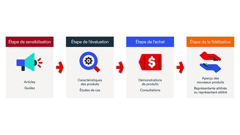 Des clientes et clients potentiels qui ne sont pas encore prêts à acheter aux clientes et clients qui ont déjà effectué plusieurs achats, chaque segment a des besoins précis. La ou le propriétaire d’entreprise doit y prêter attention et fournir des renseignements précieux au bon moment afin d’instaurer un climat de confiance et d’établir de bonnes relations.