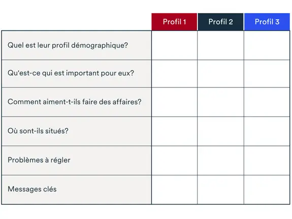 Vous pouvez commencer par définir votre clientèle idéale en utilisant un tableau comme celui du modèle ci-dessous.