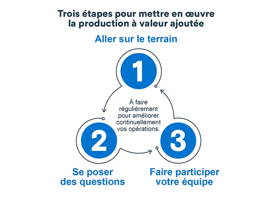 L’approche utilise les mêmes trois étapes que production à valeur ajoutée (parfois aussi appelées les trois piliers du Kaizen): aller sur le terrain, se poser des questions et faire participer votre équipe.